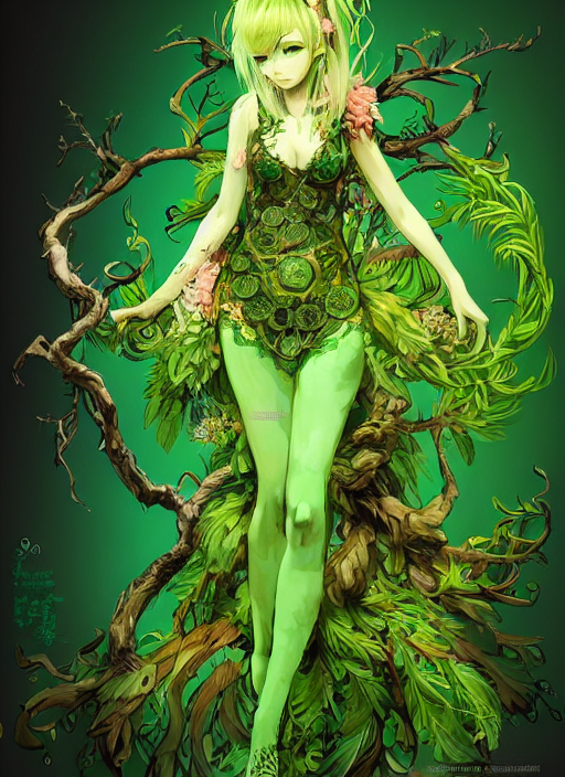 Prompthunt Full Body Portrait Of A Cute Dryad Girl With Short Blond And Green Hair Wearing Ornate Green Dress Vibrant Colours In Style Of Yoji Shinkawa And Hyung Tae Kim Trending On Artstation